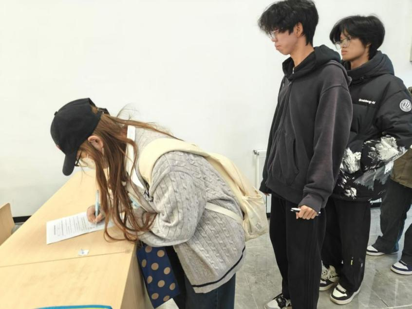 “化小水”们排队抽取座位号并签下《诚信考试承诺书》。