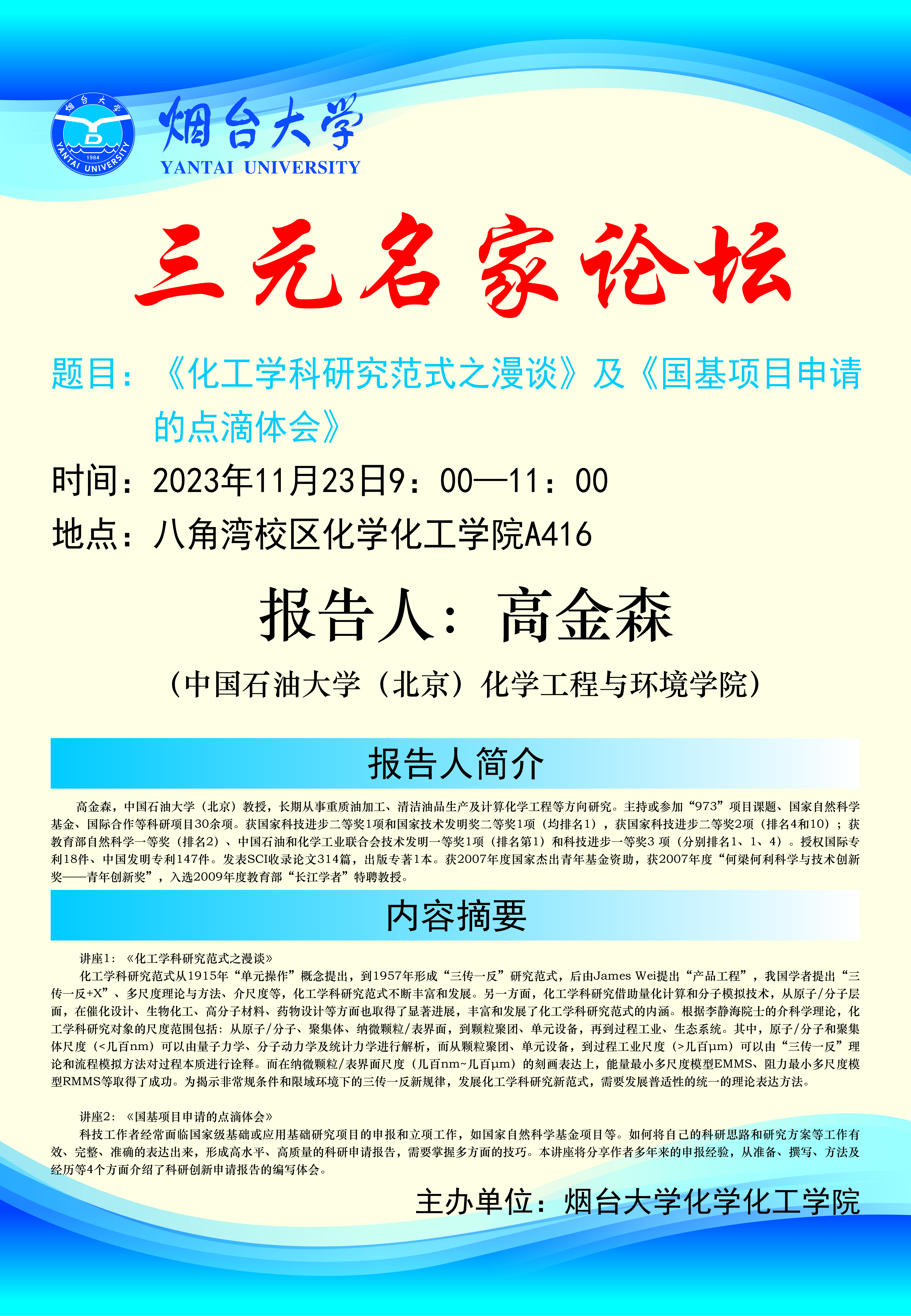 三元名家|《化工学科研究范式之漫谈》及《国基项目申请的点滴体会》