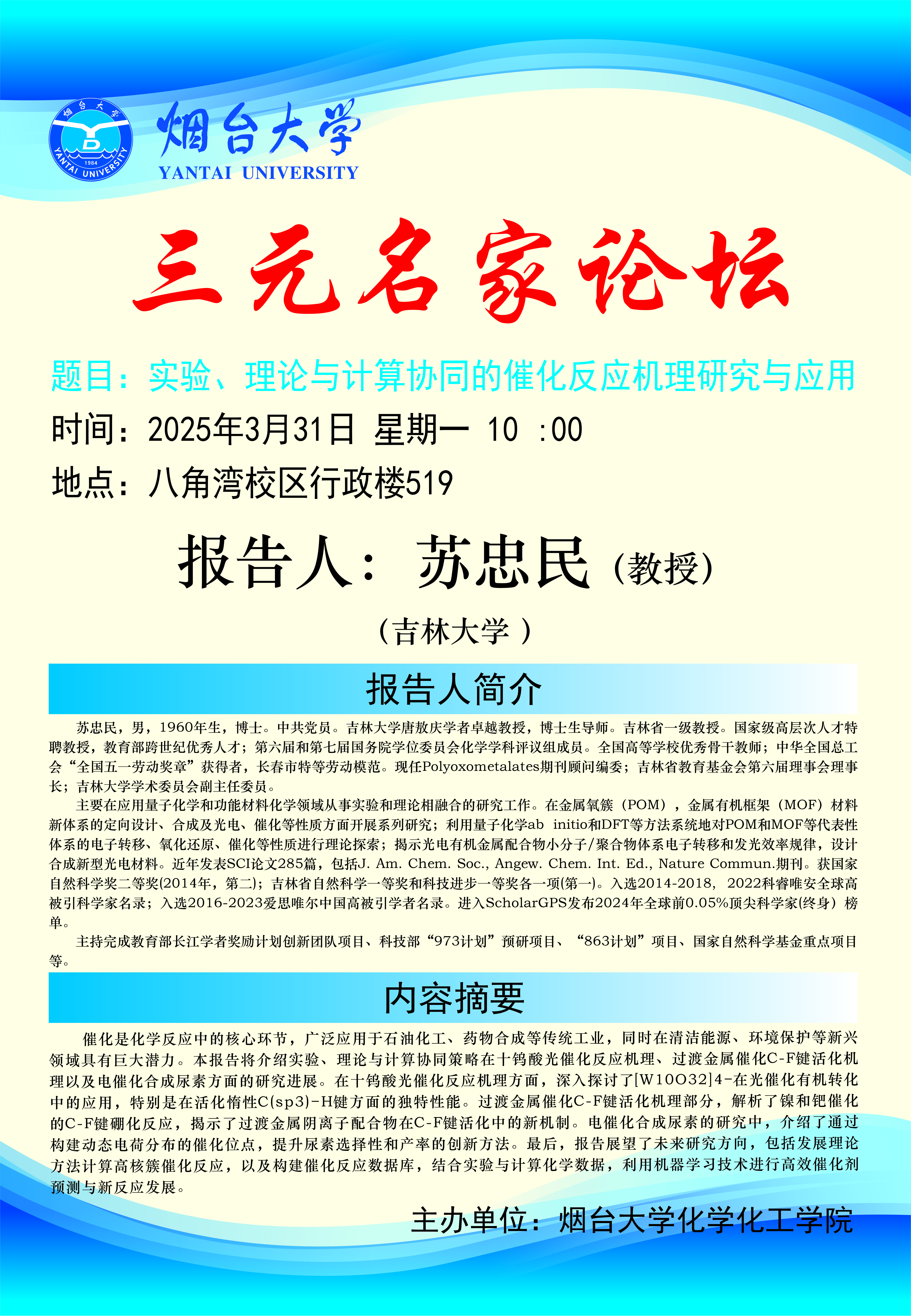 三元名家论坛(化院)丨《实验、理论与计算协同的催化反应机理研究与应用》,主讲:苏忠民教授