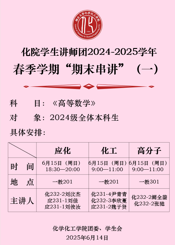 期末学业辅导 | 化院员工讲师团2024-2025学年春季学期“期末串讲”等你来(一)