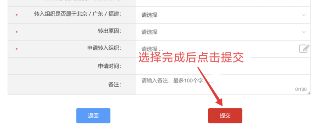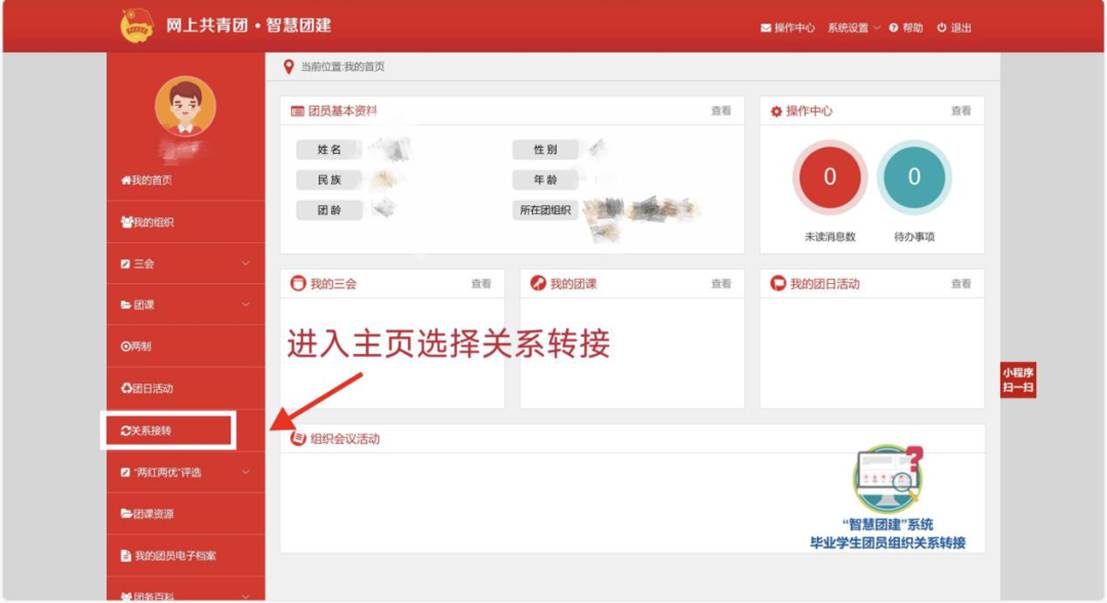 页面左侧列表点击【关系接转】,选择申请转入组织及接转原因,填写基本信息与情况并提交,等待原公司团委管理员审核。
