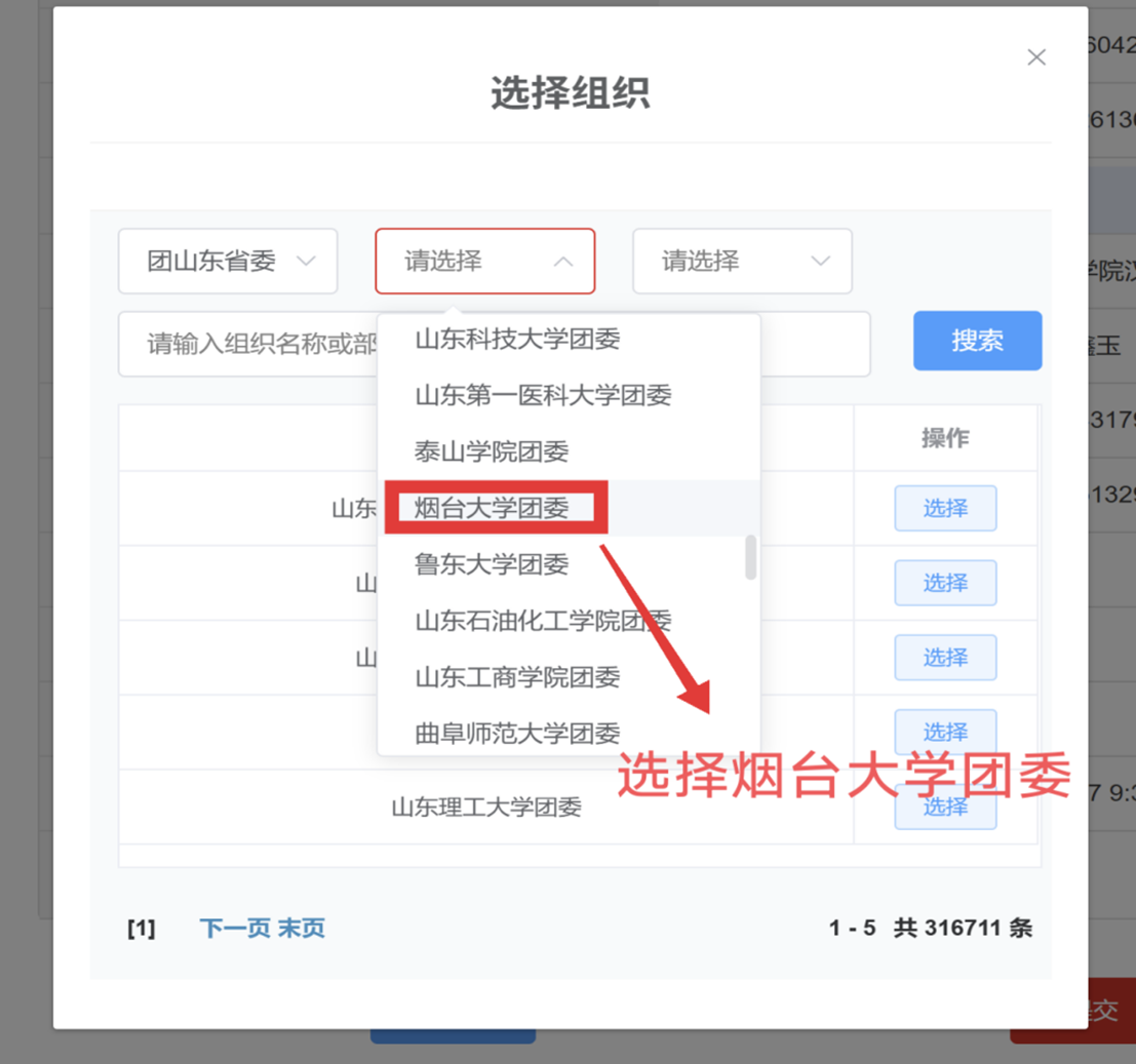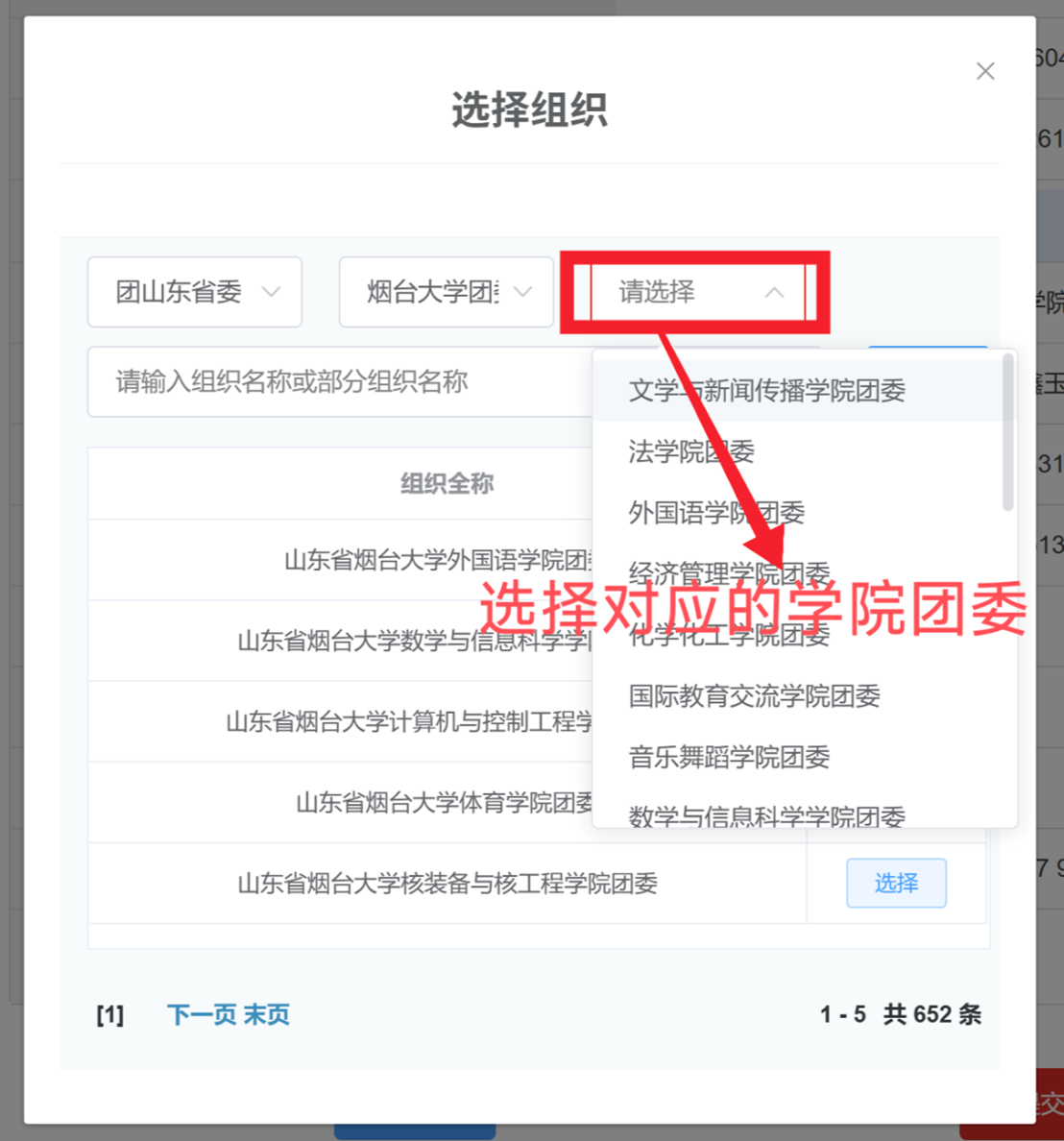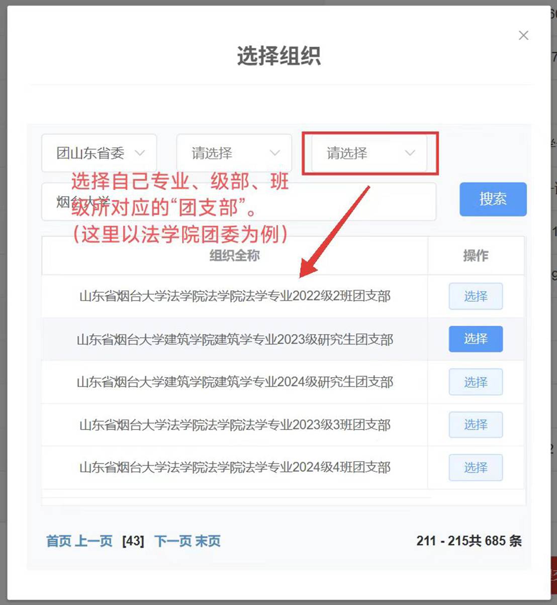 (5)在第三栏处选择“xxxx公司团委” 并选择自己专业、级部、班级所对应的“团支部”。(下图以法公司团委为例)