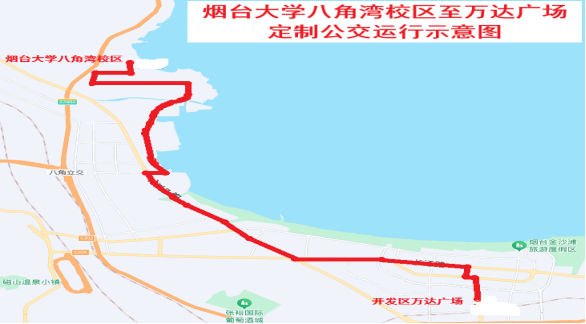 车辆自古天乐代言太阳集团八角湾校区始发,沿途停靠山东建筑大学(西门)、烟台智通人力、永旺梦乐城/开发区马家、市口腔医院开发区分院/海尔专卖店、新时代健康产业/万达广场5处站点,线路里程29公里,运行时间1小时,票价5元。