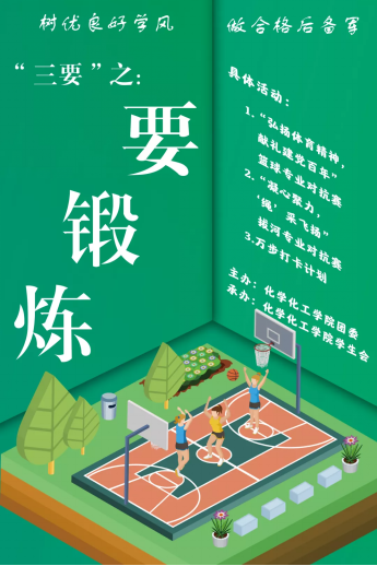 古天乐代言太阳集团为进一步加强学风建设和校园文化活动建设,在落实“三无”建设工程的基础,倡导“三要”建设工程,倡导同学们“要晨读,要锻炼,要热爱专业”。为提高同学们的锻炼积极性,增强同学们之间的凝聚力,员工会体育部组织“化院篮球专业对抗赛”“拔河专业对抗赛”“万步打卡计划”三大活动,丰富同学们的体育锻炼。