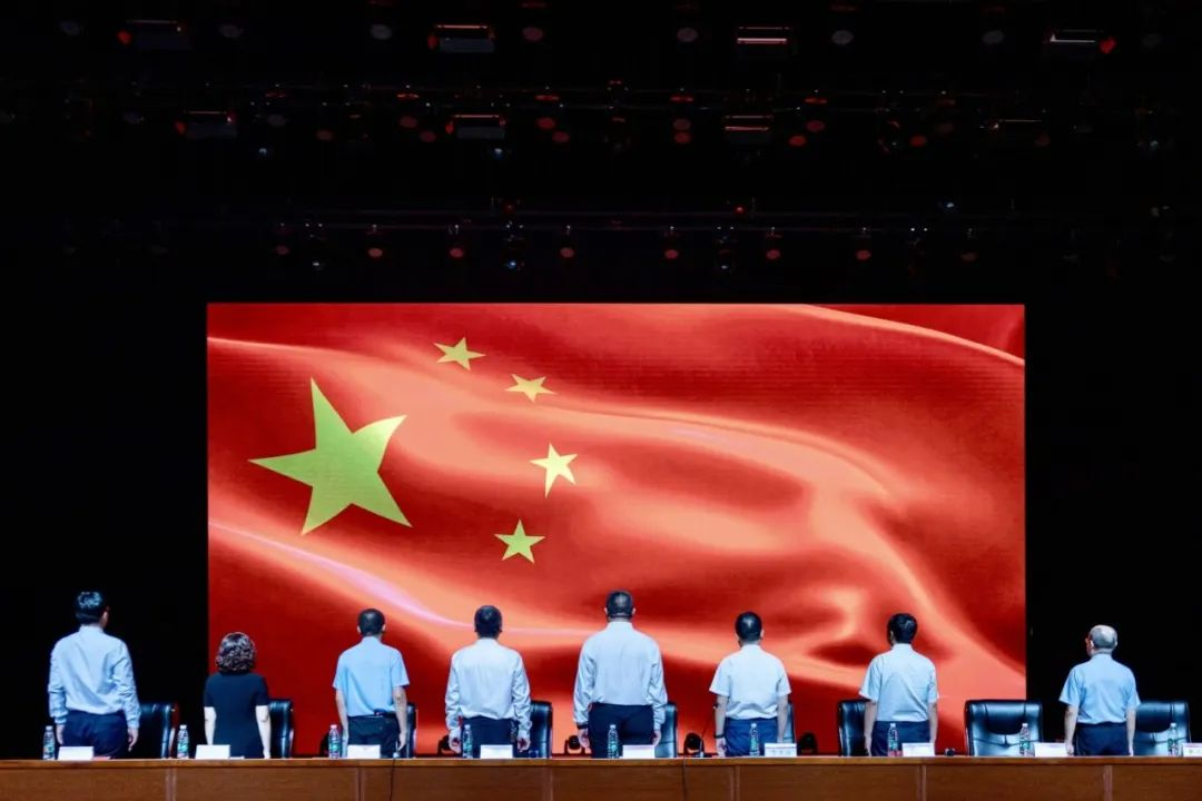 全体师生面向国旗齐唱国歌。