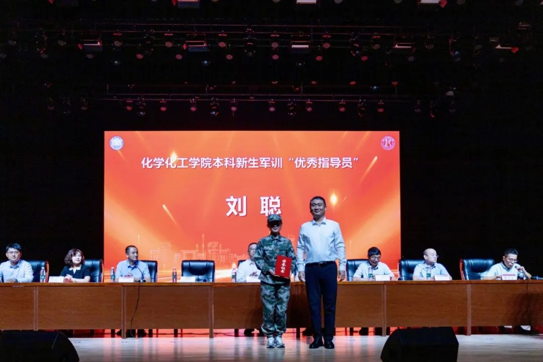 公司党委副书记胡大鹏老师为新生军训优秀指导员、本科新生辅导员刘聪老师颁奖。