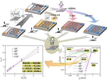 近日,公司赵玉潮教授团队利用等离子体辅助接枝改性,将甲基丙烯酰乙基磺基甜菜碱(SBMA)及1H,1H,2H,2H-全氟癸基三乙氧基硅烷接枝于聚甲基丙烯酸甲酯(PMMA)材料表面,制作了表面接触角不同的微通道,深入研究了其对气-液两相流动与气泡形成过程的影响规律,为微通道反应器的个性化设计提供了基本科学数据。