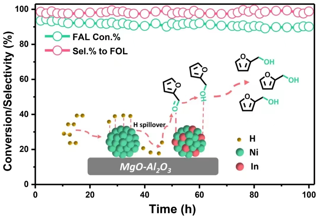 NiIn0.2/MgO-Al2O3催化剂表现出较高的反应稳定性,100小时稳定性试验后,FAL转化率仅下降3.2%(从93.3%下降到90.1%)。同时,对FOL的选择性也稳定维持在98%左右。对使用后的催化剂进行表征后发现,活性的下降是由于FAL在NiIn0.2/MgO-Al2O3催化剂表面聚合所致。
