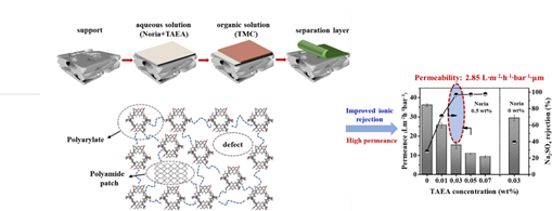 近日,公司赵玉潮教授课题组利用大环分子作为主体构建单元,基于界面聚合反应,通过 “打补丁”策略制备了聚芳酯-聚酰胺复合纳滤膜。大环分子内部空腔有效降低了水分子传质阻力,纳滤膜渗透率达2.85 L·m−2·h−1·bar−1·μm,硫酸钠截留率高于96%,且具有优良的耐压性和长期稳定性。