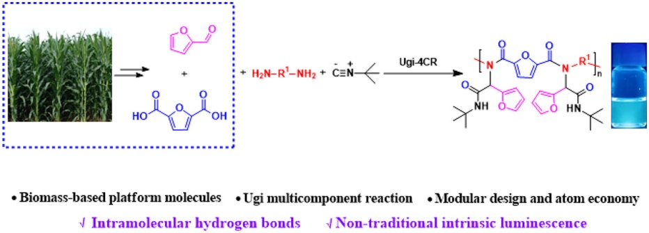 近日,公司秦玉升教授课题组利用糠醛生物基单体参与的Ugi多组分聚合反应高效制备了一系列结构可控的生物基聚酰胺。该反应具有无需催化剂、聚合条件温和、反应原子经济性高的突出优势,并展示出了非传统发光特性。该团队针对糠醛基聚酰胺结构设计成功实现了产物的荧光可控,并对其应用进行了探索。本研究为多组分聚合产物应用提供了新的方向,也为聚酰胺荧光发光机制的研究提供了新思路。