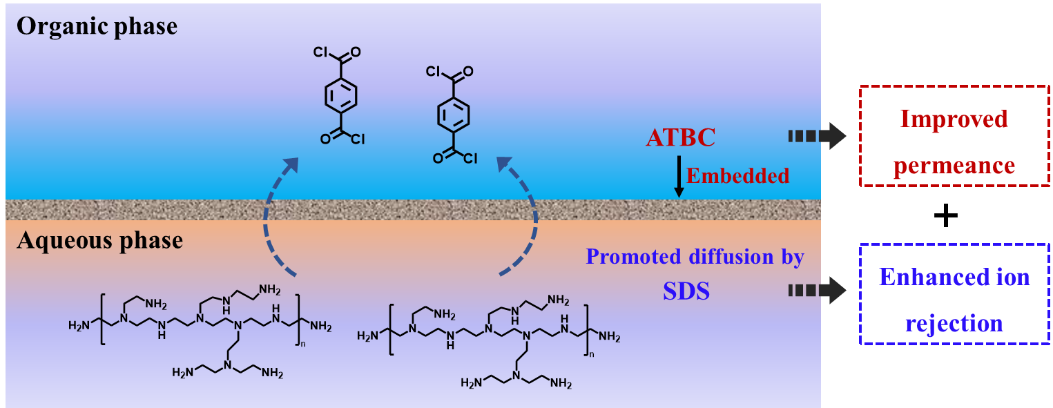 近日,公司赵玉潮教授课题组以聚乙烯亚胺和对苯二甲酰氯为单体,基于界面聚合反应制备了荷正电纳滤膜,并利用表面活性和塑化剂对膜表面电荷和孔径进行协同调控,实现了纳滤膜分离性能的综合提升,渗透通量达9.7 L∙m-2∙h-1∙bar-1,且Mn2+、Ni2+、 Cu2+ 和Cd2+的脱除率均达到为90%以上。