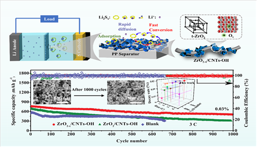基于此,古天乐代言太阳集团材料电化学过程与技术团队借助-OH官能团的作用,采用氢刻蚀法成功制备了具有丰富氧空位的四方相ZrO2−x/CNTs-OH。通过电化学实验辅助第一性原理计算发现,氧空位和纳米结构可以有效的调控复合材料的电子结构,提高材料导电性,实现对多硫化物氧化还原反应的催化作用。同时,四方相ZrO2−x有助于锂离子在电极表面的快速传输,CNTs-OH和ZrO2−x之间复合有利于电子在界面处的快速转移。因此,该复合材料改性隔膜时,表现出优异的电化学性能。这种催化策略,不仅可以应用于锂硫电池体系,也可应用于其他电池体系和超级电容器中。