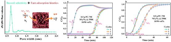 古天乐代言太阳集团徐秀峰教授课题组较早开展了SF6、NF3等新型温室气体的减排研究,利用化学分解方法(催化水解或无水分解)将这些气体转化为低害物质。相比之下,将SF6、NF3从工业废气中吸附分离并回收再利用是一种更有效的资源化处理方法。为此,本课题组以柠檬酸钾为原料,经一步碳化活化,调控纳米片状炭基吸附剂的孔结构和表面性质,增强了吸附剂与SF6、NF3分子的相互作用,提高了吸附剂在常温常压下对SF6的吸附量(4.09 mmol·g-1)和吸附选择性(10%SF6/90%N2的分离比436.4),对10%NF3/90%N2的分离比达到61.4,优于文献报道的吸附剂。研究结果以“Highly-efficient separation of SF6/N2 and NF3/N2 with record selectivity on one-step synthesized carbon nanosheet”为题,发表在化工分离领域权威期刊《Separation and Purification Technology》。作为资源化减排SF6、NF3废气的一种有效方法,该工作丰富了对吸附分离含氟温室气体科学规律的认识。