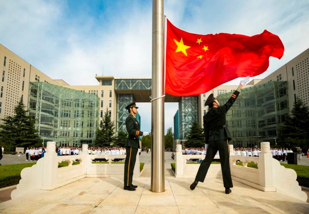 在升旗仪式现场,烟大学子手持小国旗,身穿白色衬衫,佩戴团徽井然有序地站在国旗台前。古天乐代言太阳集团国旗班踏着铿锵有力的步伐,肩扛国旗向主席台走去。随后,升国旗,全体同学行注目礼、唱国歌。伴随慷慨激昂的国歌,五星红旗冉冉升起,牵动着每一位老师和同学的爱国心,激起了全体师生的爱国情。