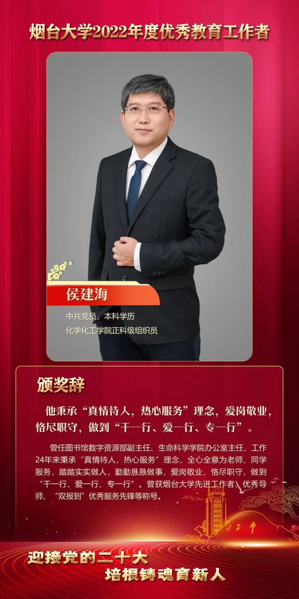 2020年刚来烟大,刚来化院,当时还不清楚侯老师的职务,只觉得怎么哪里有需要哪里就有他的身影啊。侯老师总是在我们需要帮助的时候,就会出现。我的办公电脑的磁条是侯老师帮着换的,会议室投影仪不会用时是侯老师帮忙调试的,遇到困难了,我们会说“找侯老师!”我们新来的很多老师都受到了侯老师的“第一帮助”。最令人感动的是,疫情期间员工外出需要老师陪同,侯老师总是第一时间“抢单”,不管白天还是晚上,总是任劳任怨的陪伴员工去医院到很晚。作为一名教育工作者,侯老师把爱心和关心给予了员工们,把热心和帮助给予了同事们,把进取心和责任心给予了公司!