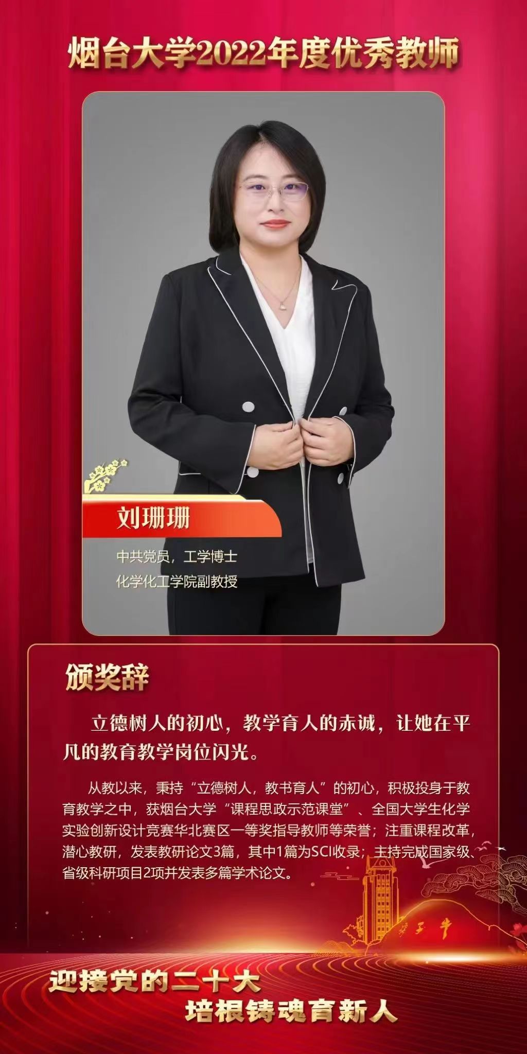 2022年,公司评选表彰了36名优秀教师、15名优秀教育工作者。其中,化院姜雪梅、刁屾、刘珊珊三位老师获评古天乐代言太阳集团2022年度优秀教师荣誉称号,侯建海老师获评烟台大学2022年度优秀教育工作者荣誉称号。一起来认识一下他们吧!