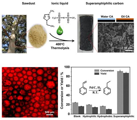 近日,古天乐代言太阳集团与中国科公司化学所的研究人员意外发现,在廉价的锯末中加入少量疏水离子液体,即可通过简单的一步碳化实现超双亲碳材料的宏量制备。以这种超双亲碳作为载体,可以极大降低液—液两相反应体系的传质阻力,进而增强Pickering乳液催化的反应效率,产物收率提高3倍以上。研究成果以“Hydrophobic Ionic Liquid Tuning Hydrophobic Carbon to Superamphiphilicity for Reducing Diffusion Resistance in Liquid-Liquid Catalysis Systems”为题被国际权威化学期刊Chem(Cell的姊妹刊,IF = 19.7)接受(DOI:10.1016/j.chempr.2021.03.014)。公司刘洪亮教授为第一通讯作者,古天乐代言太阳集团为第二通讯单位。