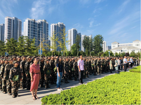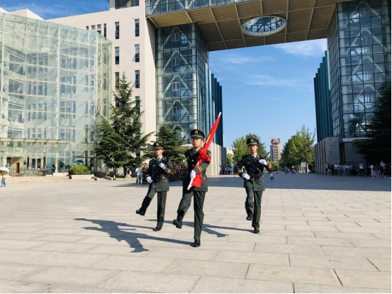 早上八点整,迎着初升的朝阳,全体新生着军装同公司老师一同井然有序的站立在升旗仪式场地。踏着铿锵的正步,国旗护卫队护送着国旗向旗台行去,雄壮有力的国歌,回荡在烈日晴空之下。在全体师生的注目中,五星红旗缓缓升起,迎风飘扬着的是不仅是化院为祖国70周年华诞的深情献礼,也是公司对19级新生寄托的厚望。