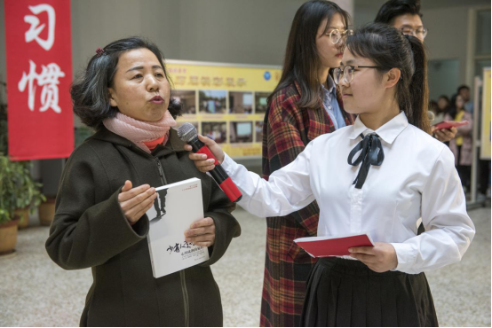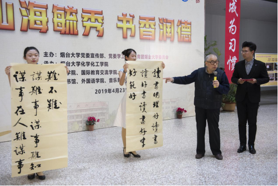 退休老教师韩冬冰再次应邀来参加读书节开幕式,并现场为读书节题字:“读书明理,好读书,读好书,读书好,学好能好;谋事在人,难谋事,谋难事,谋事难,知难不难”。韩老师现场解读了这副对联,赢得大家阵阵掌声。