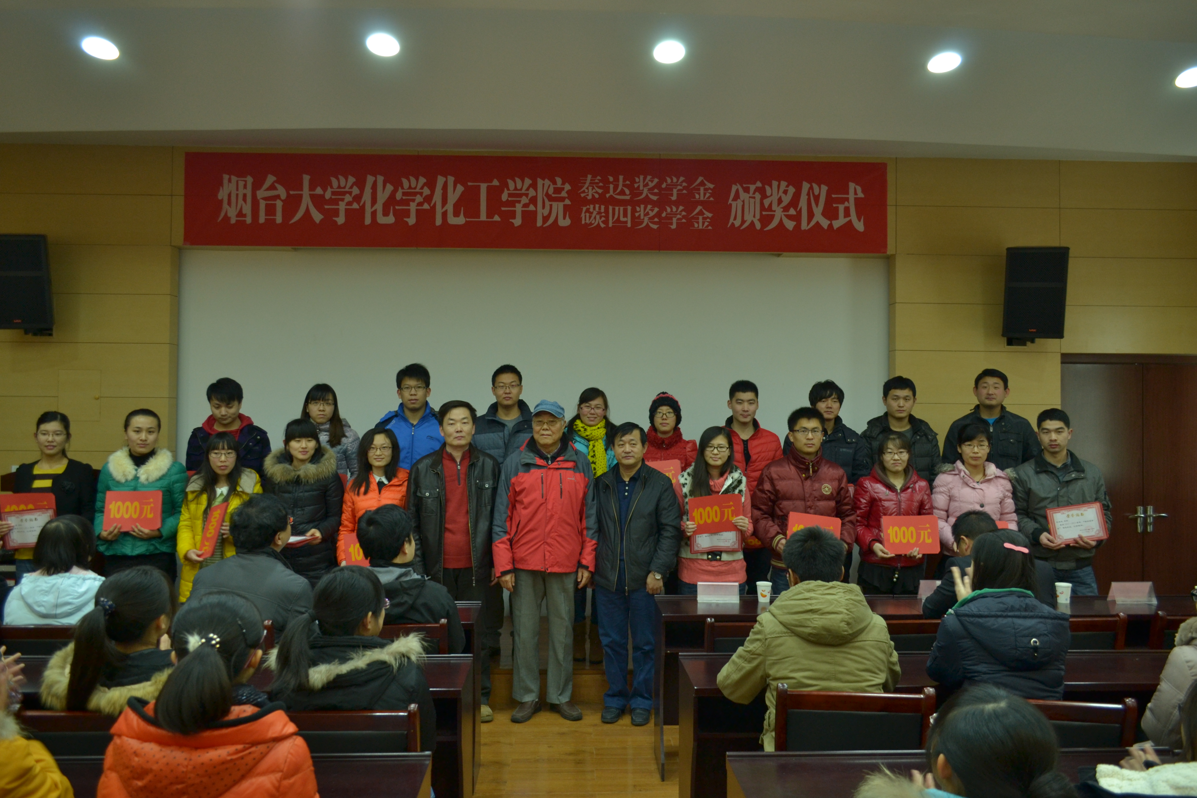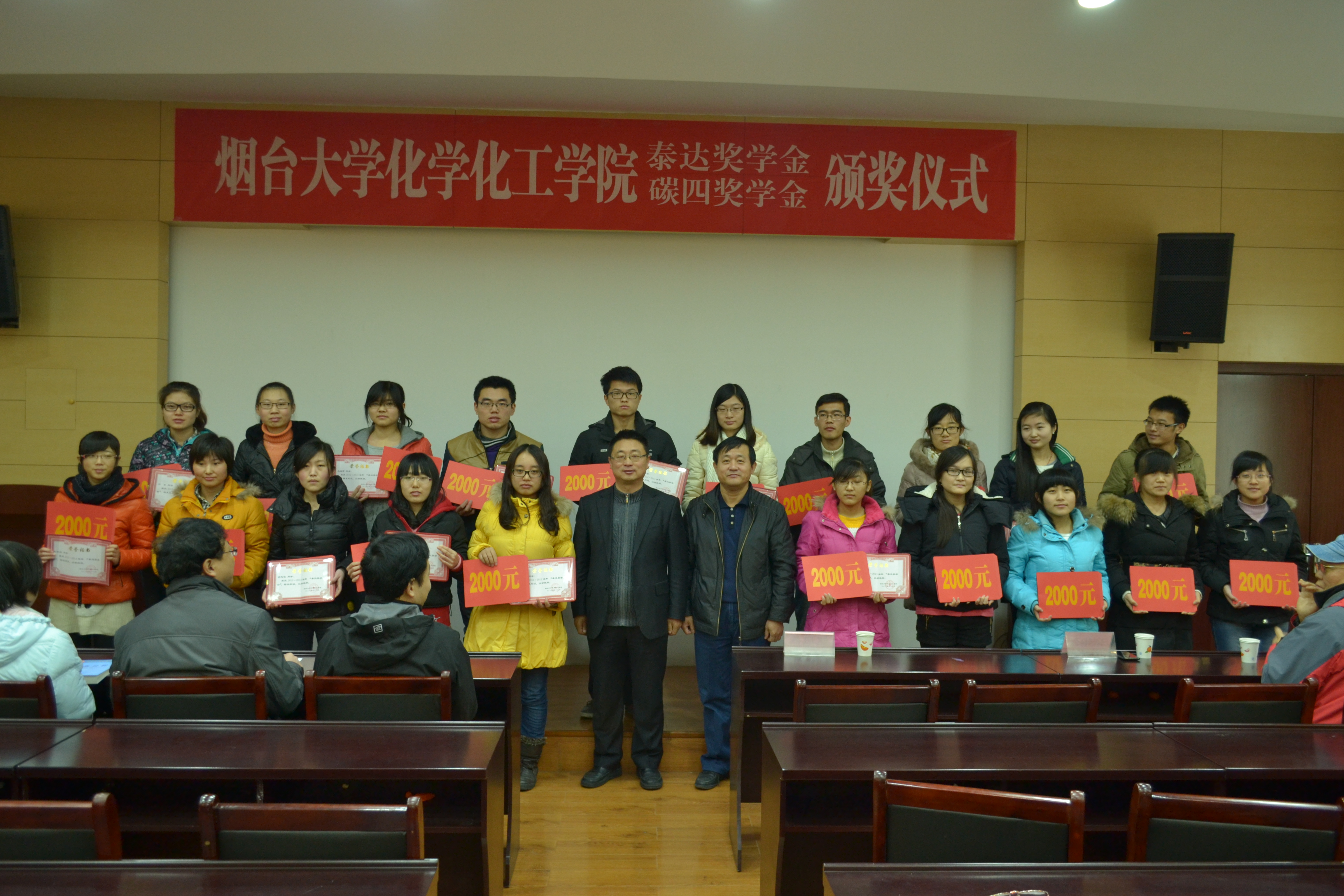 泰达奖学金于2012年5月由烟台泰达集团设立,共出资50万元,为期十年,用于奖励品学兼优的本科生。碳四奖学金于2012年7月由公司碳四分离课题组设立,共出资30万元,为期五年,用于奖励勤奋学习、勇于创新的化院本科生和研究生。本次共有20名本科生荣获泰达奖学金,20名本科生和21名研究生荣获碳四奖学金。