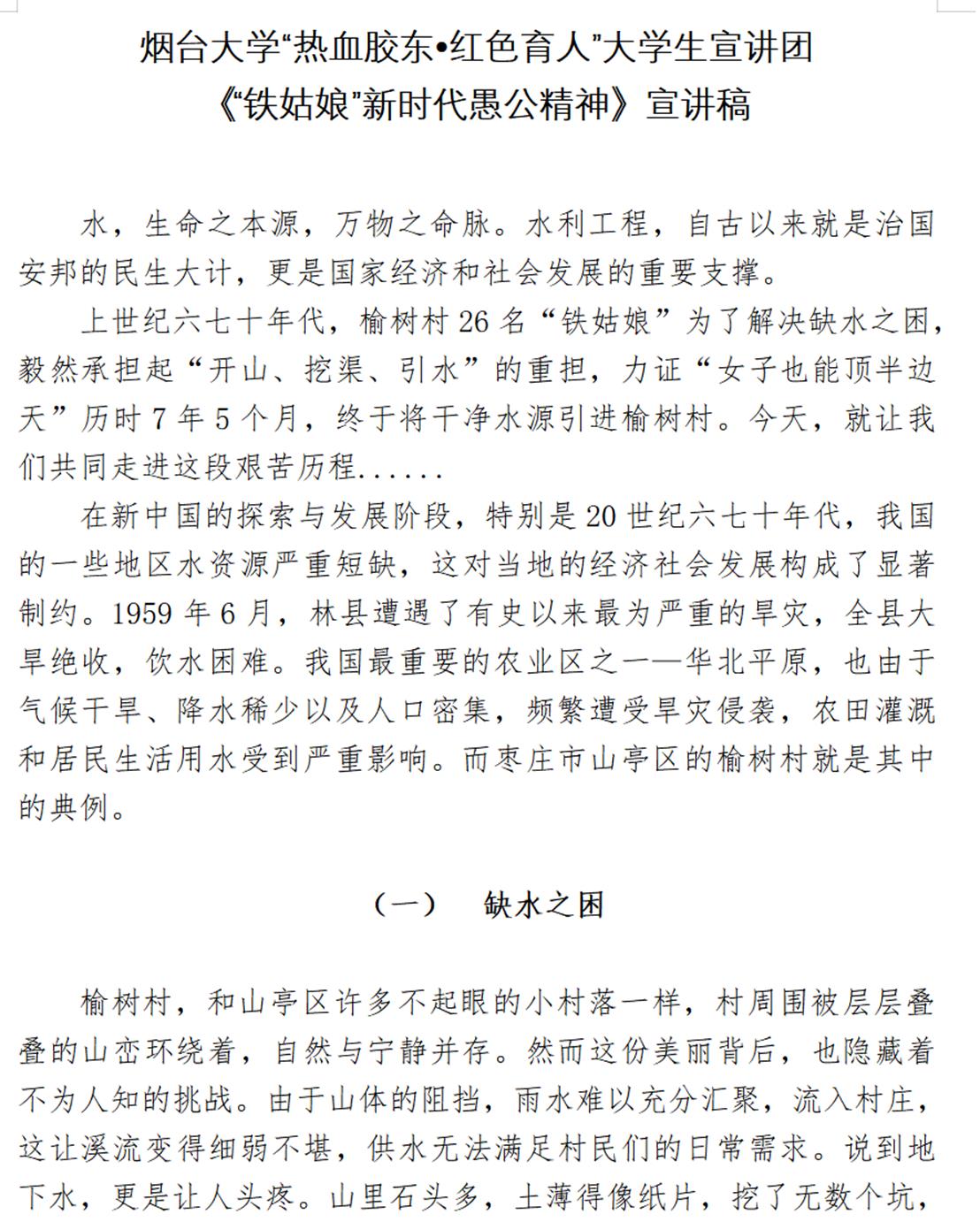 《“铁姑娘”新时代愚公精神》宣讲稿。