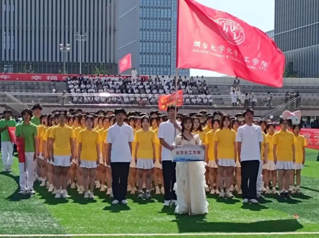 运动员们入场的同时,看台上翻花队的“化小水”们也在为运动员们加油助威。他们手里紧握着一柄圆扇,随着鼓声的节奏,扇子开始变幻颜色,如同盛开的花朵,摆出“爱专业”“爱化学”“2024”“NO.1”的字样,为大家献上一场视觉盛宴。