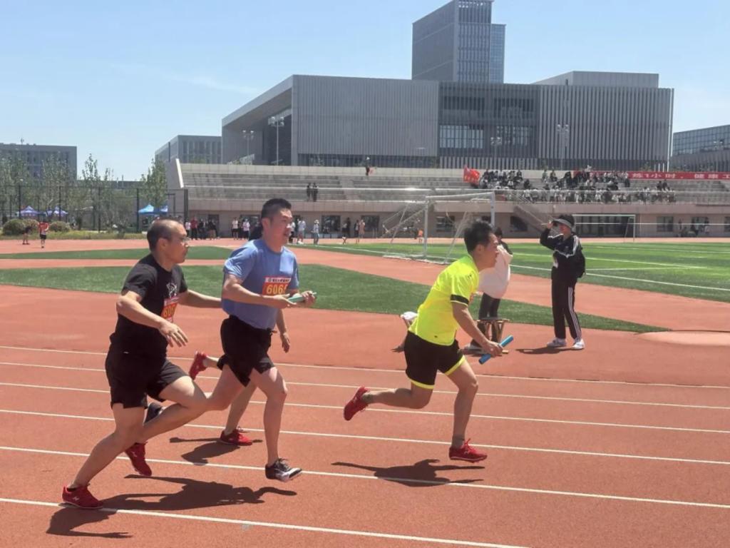 张成友老师正在进行党政工团4✖100接力比赛。