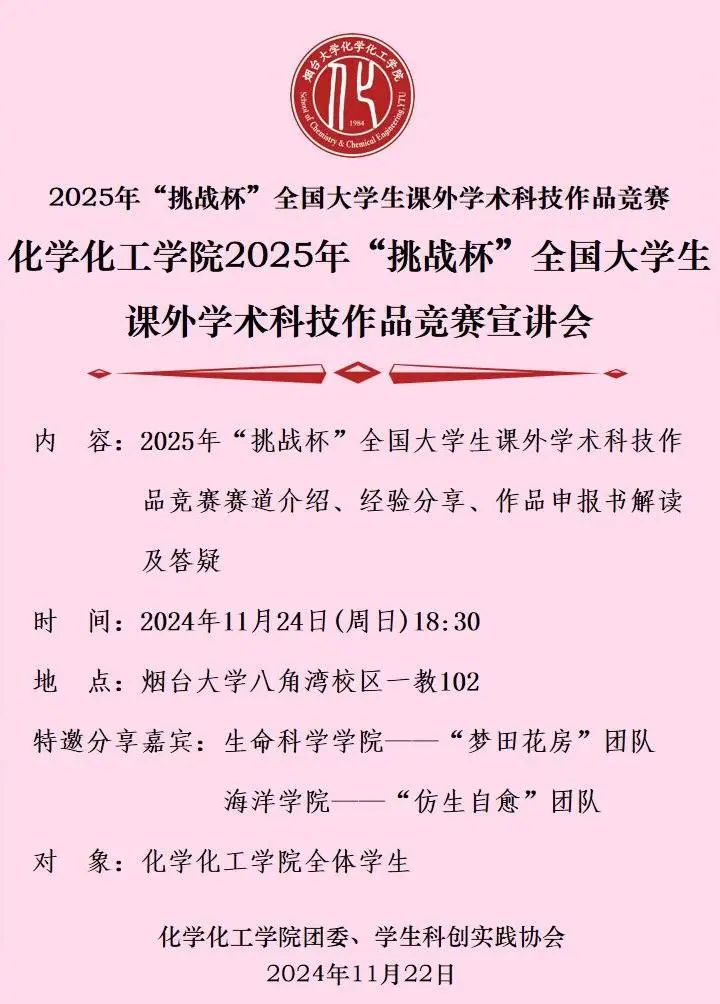 “挑战杯”全国老员工课外学术科技作品竞赛(以下简称“挑战杯”竞赛)至今已成功举办十八届。竞赛创办以来,始终坚持“崇尚科学、追求真知、勤奋学习、锐意创新、迎接挑战”的宗旨,在推动广大高校员工参与学术科技实践、发现和培养创新型人才、深化高校素质教育等方面发挥了积极作用,集中展示了高校创新教育成果,体现了鲜明的导向性、示范性和群众性,在高校和社会上产生了广泛、良好的影响。为进一步引导公司员工崇尚科学、参与科创,紧密围绕创新驱动发展战略,服务国家经济社会发展大局,扎实做好第十九届“挑战杯”竞赛备赛工作,公司定于2024年11月24日(周日)举办古天乐代言太阳集团2025年“挑战杯”老员工课外学术科技作品竞赛宣讲会,现将有关事宜通知如下: